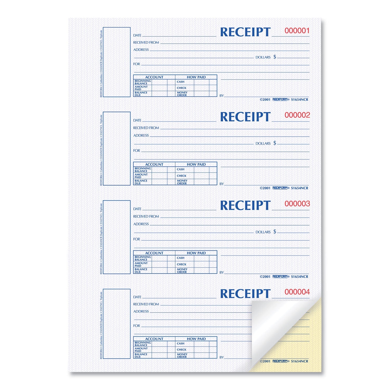 - Durable Hardcover Numbered Money Receipt Book, Two-Part Carbonless, 6.88 x 2.75, 4 Forms/Sheet, 300 Forms Total