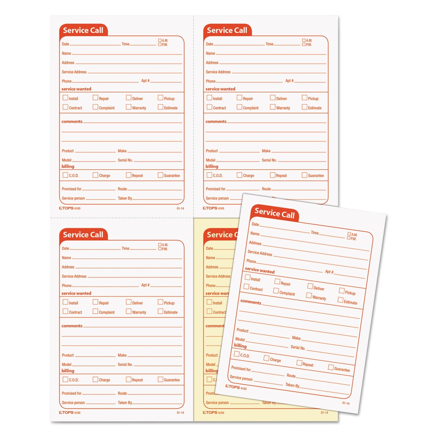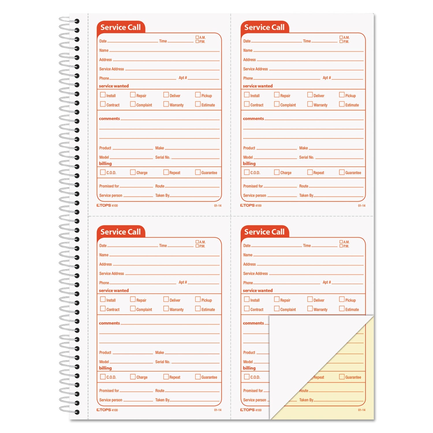 - Service Call Book, Two-Part Carbonless, 5.5 x 3.88, 4 Forms/Sheet, 200 Forms Total