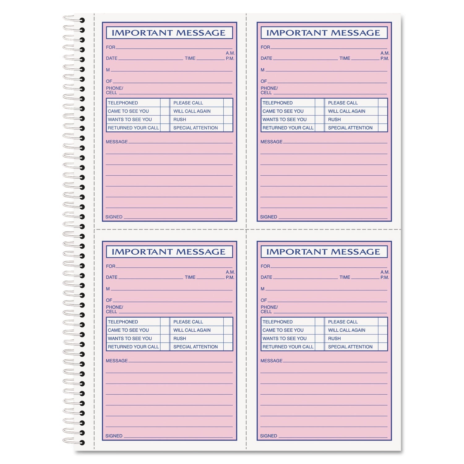 Quick check-off style with special area for fax and mobile phone numbers. Space for important phone numbers. Two-part carbonless copies remain in book as permanent record.