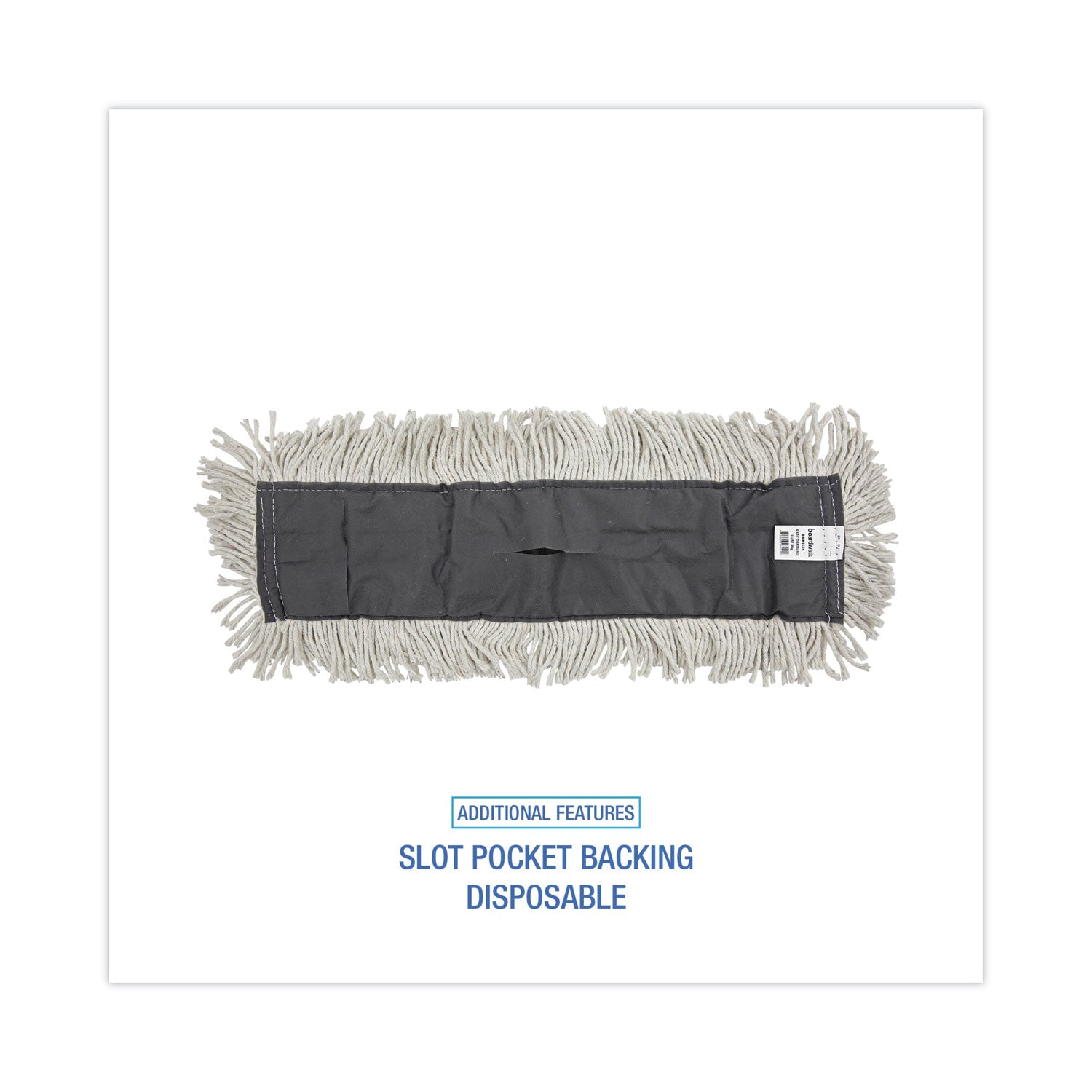 Four-ply, pretreated yarn, dust mop head. Equipped with a slot pocket backing which allows a metal dust mop frame to slide into its place quickly and easily. Sewn center fringe for added coverage and durability. The disposable head can be discarded when dirty. Ideal for use on floors that require dusting, with or without cleaning spray. Handle and frame are sold separately.