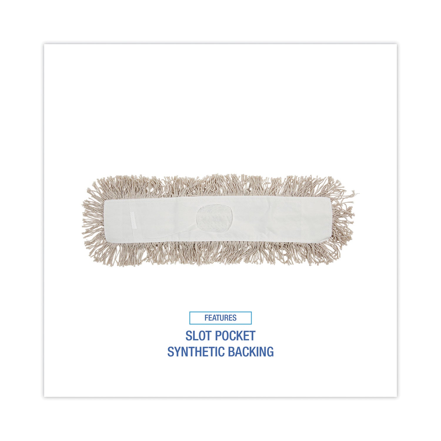 Ten-ply, Hygrade white cotton, cut-end design enhances durability while minimizing snags. Quick-drying, absorbent, slot pocket style with synthetic backing. Used for attaching a mop handle and dusting floors. Works with spray or liquid dust mop treatment and other solutions used to dust floors and add shine. Great for general purpose cleaning and wiping floor surfaces of various materials. Mop handle and dust mop frame are sold separately.