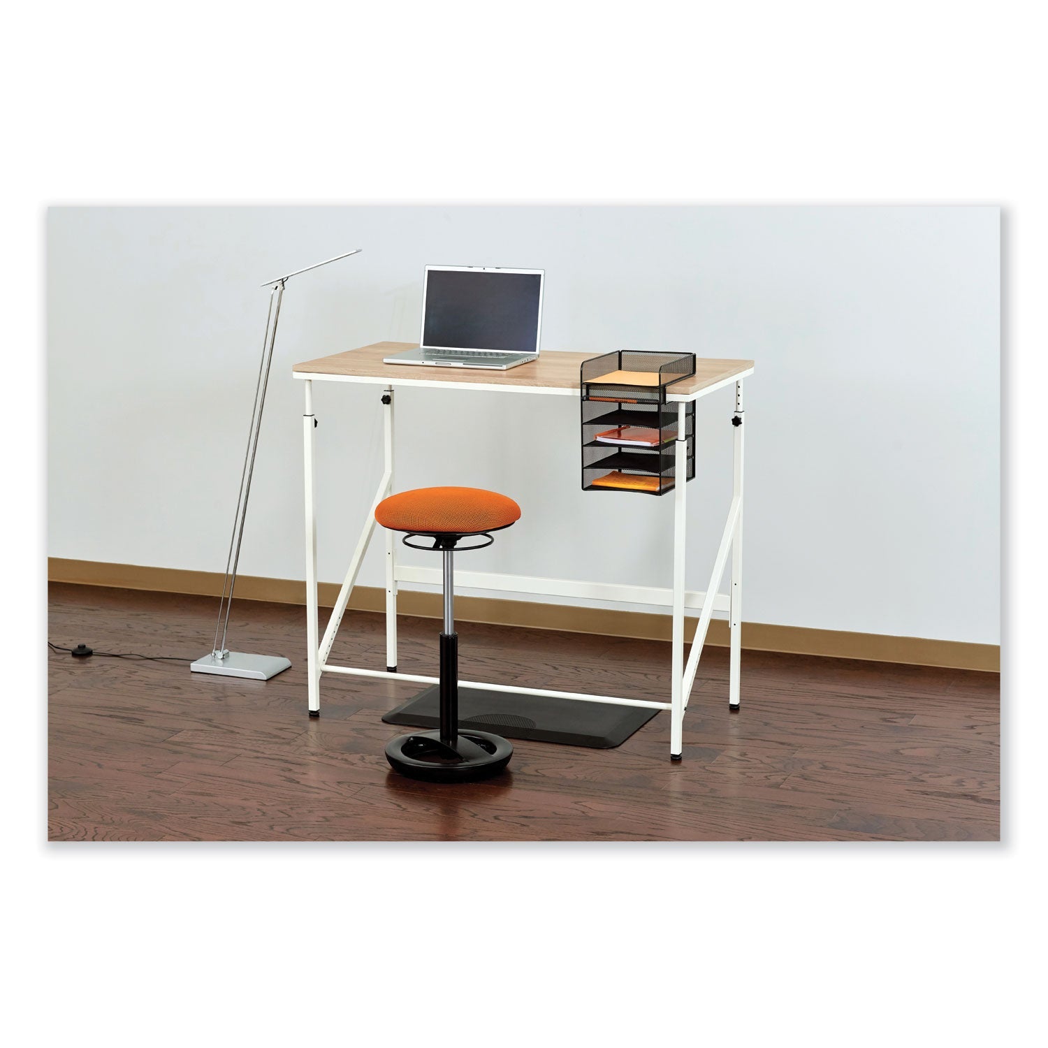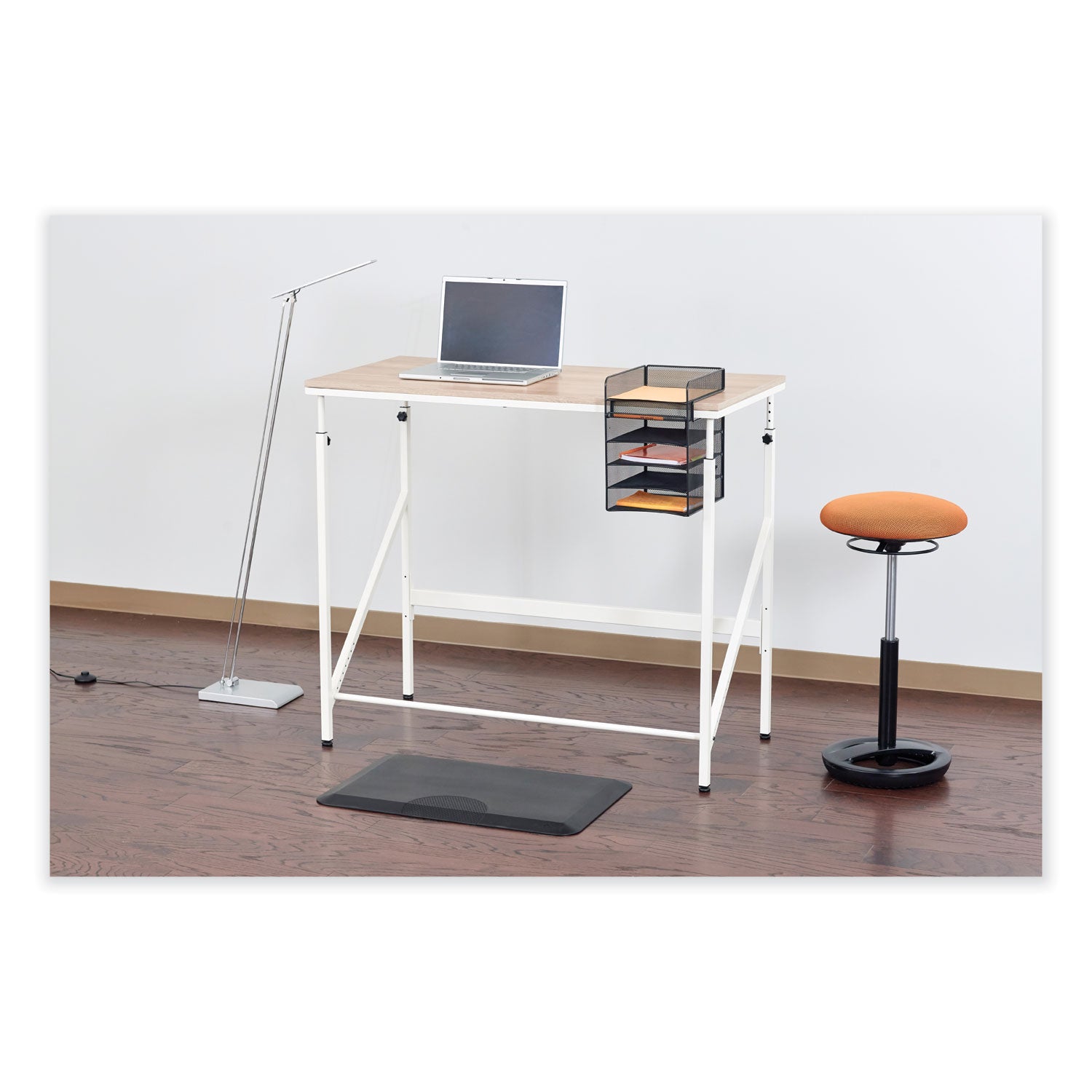This horizontal hanging storage unit is a wire mesh organizer that easily attaches to a desktop and hangs below it, providing underdesk storage that saves space and time. Features one desktop tray and four underdesk trays for sorting letter-size documents, folders and files. It also has an underdesk pencil tray for storing pens, pencils and other supplies. The hanging storage design keeps your desktop clutter free and pairs well with standing-height or adjustable-height desks or tables. This sleek mesh organizer attaches to surfaces up to 1.75 thick and includes a rubber-headed tightening screw so that it can be securely mounted without damaging the surface. Created with a steel base and powder coat finish for added durability.