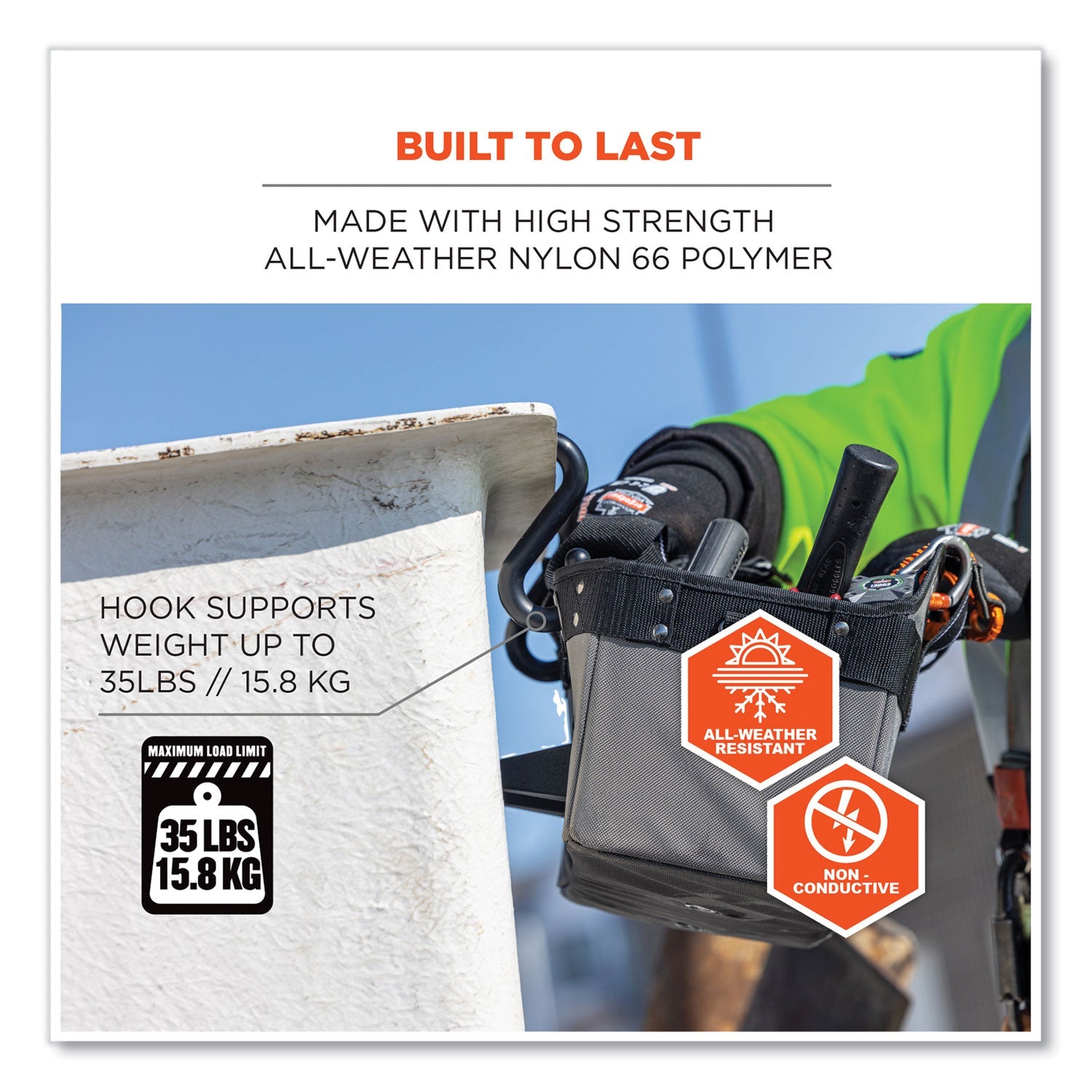 Aerial bucket hook easily fits over the lip of utility buckets to allow workers to securely hang tool bags, buckets, boards/aprons and more for convenient access and prevention of dropped objects. By hanging tools and bags from both sides of this two-sided S-hook, workers can maximize space in compact buckets by keeping gear off the floor and out of the way. Made with high strength all-weather nylon 66 polymer, this durable bucket hook supports weight up to 35 lbs.