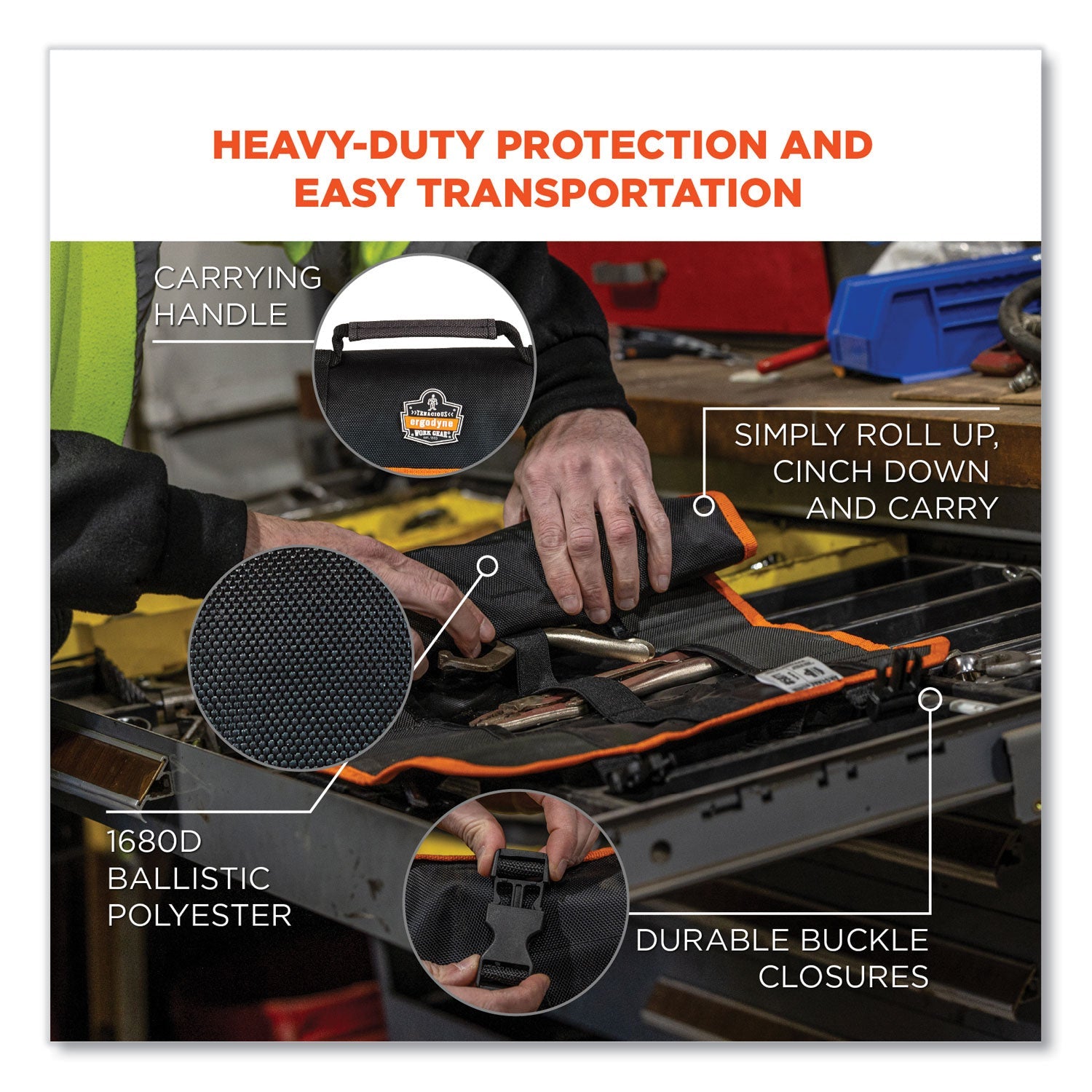 - Strong 1680D ballistic polyester with water-repellant finish protects tools in rough environments.