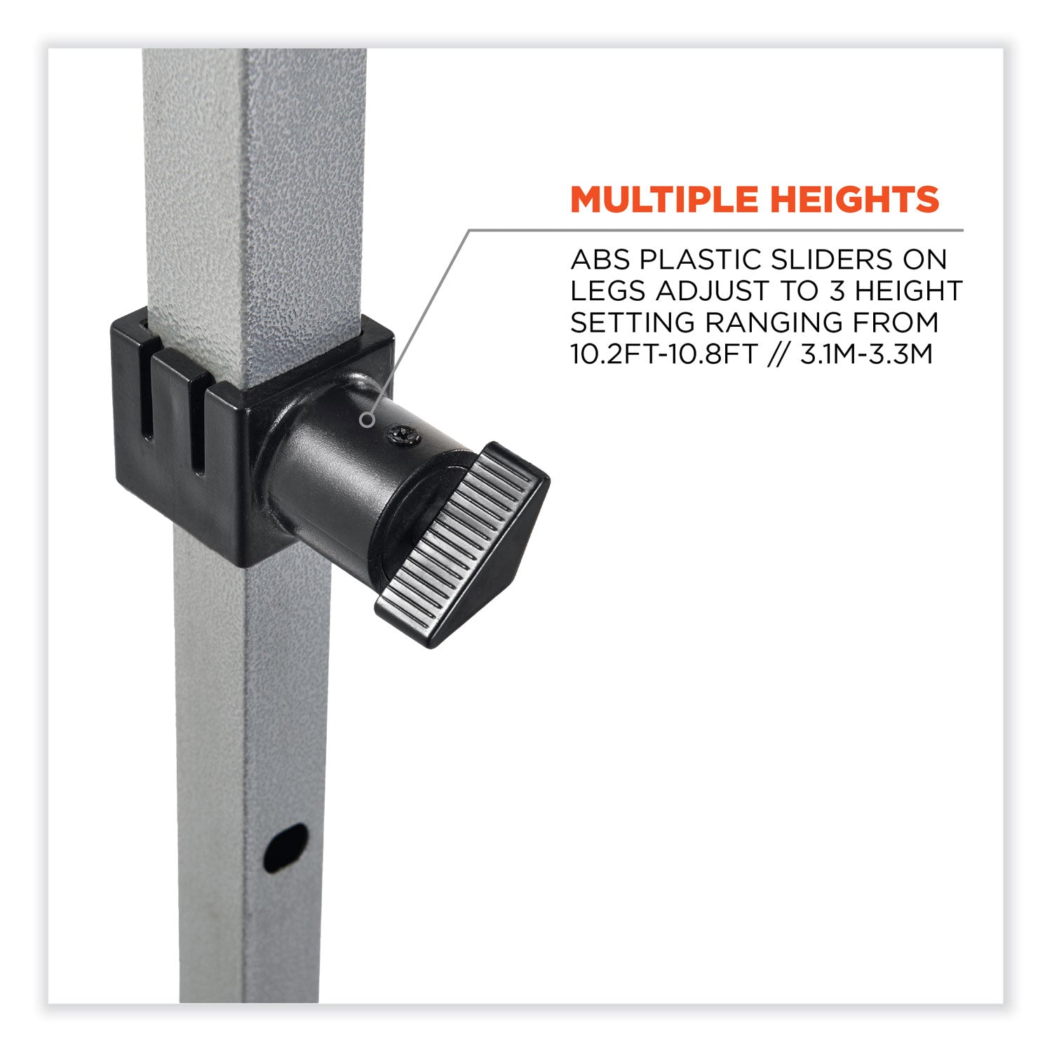 A durable portable shelter providing fast, long-lasting relief from the sun, wind, and rain with a 10 ft x 10 ft footprint. It includes one tent, two detachable side panels, two weight bags and a carrying bag. The weight bags can be quickly and easily filled with dirt or sand and placed around opposite legs of the tent to provide extra security on windy days. The powder-coated steel frame is built to withstand the elements and wont easily bend or rust like aluminum. ABS plastic sliders on the adjustable legs are more durable and easier to adjust compared to other tents that have push-pins. This portable tent offers three different heights ranging from 10 ft to 14 ft. Made with thick, high-quality 300-denier polyester material, this heavy-duty 10 x 10 canopy also boasts waterproofing polyurethane coating (PU) and UV treatment as well as reinforced corners to withstand tough conditions.