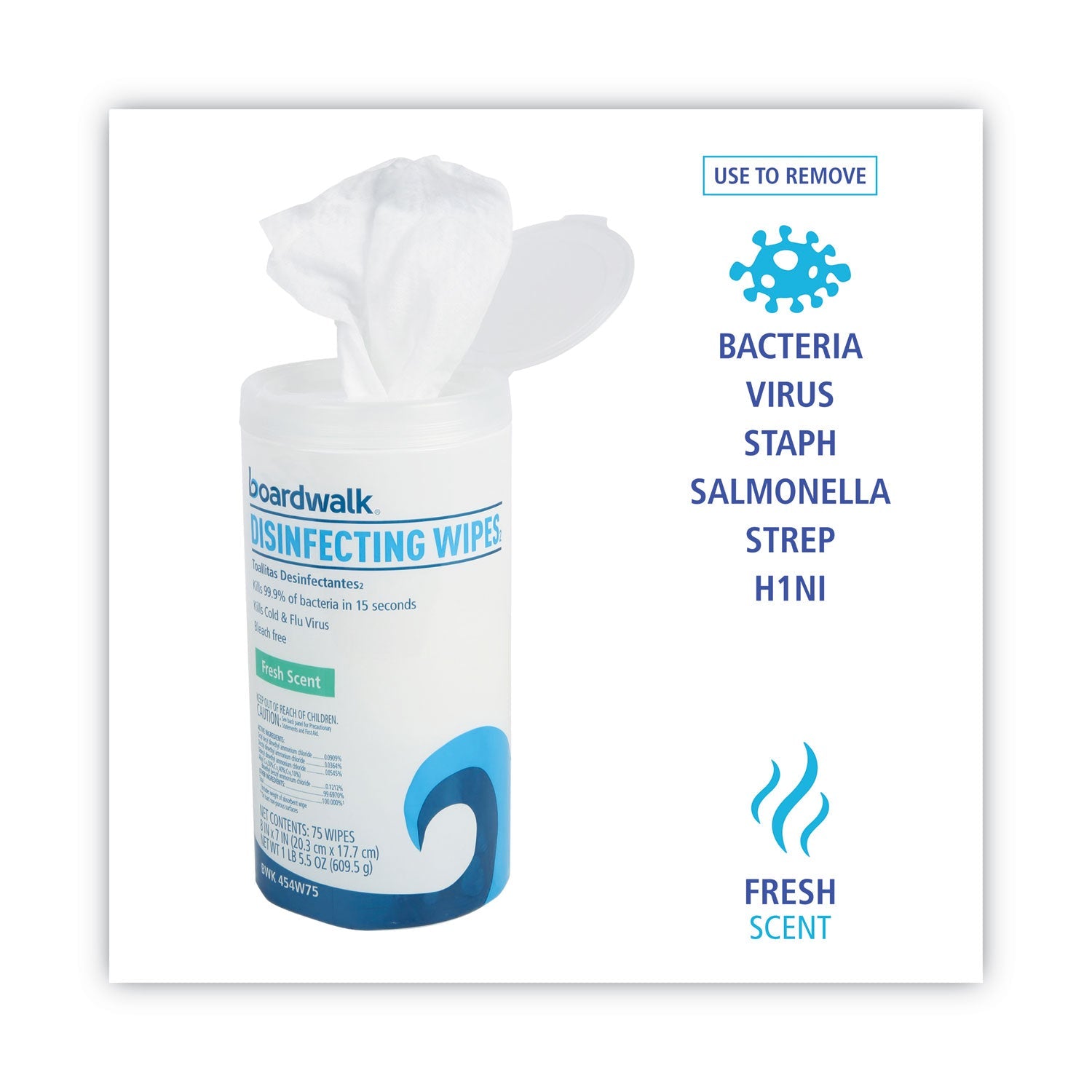 Convenient cleaning wipes that disinfect hard surfaces in one easy step. Bleach and alcohol-free formula kills 99.9% of E. coli, Salmonella, Staph, Strep, and Covid-19. Also effective against Influenza A and H1N1 flu virus. Ready-to-use, premoistened wipes are great for offices, clinics, day care centers, restaurants, schools and nursing homes. Easy dispensing canister filled with 8" x 7" white wipes.
