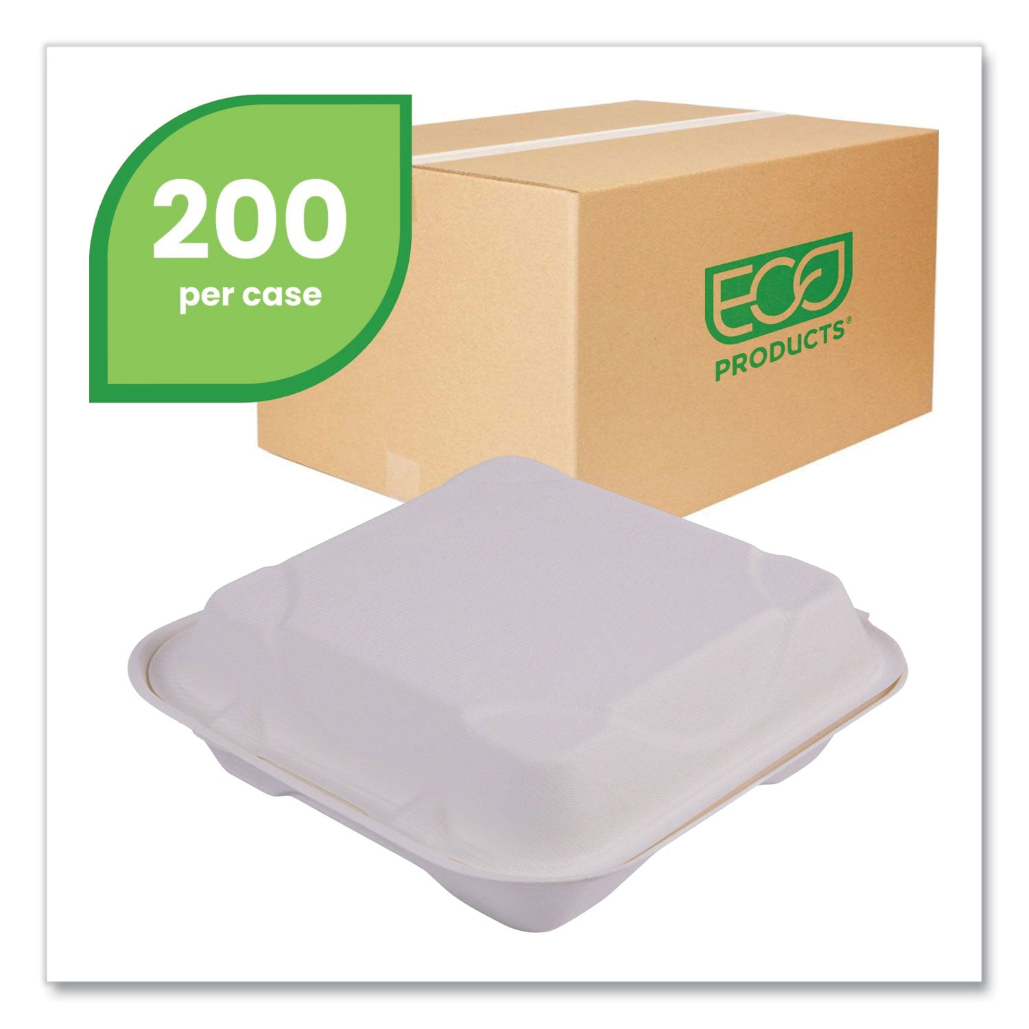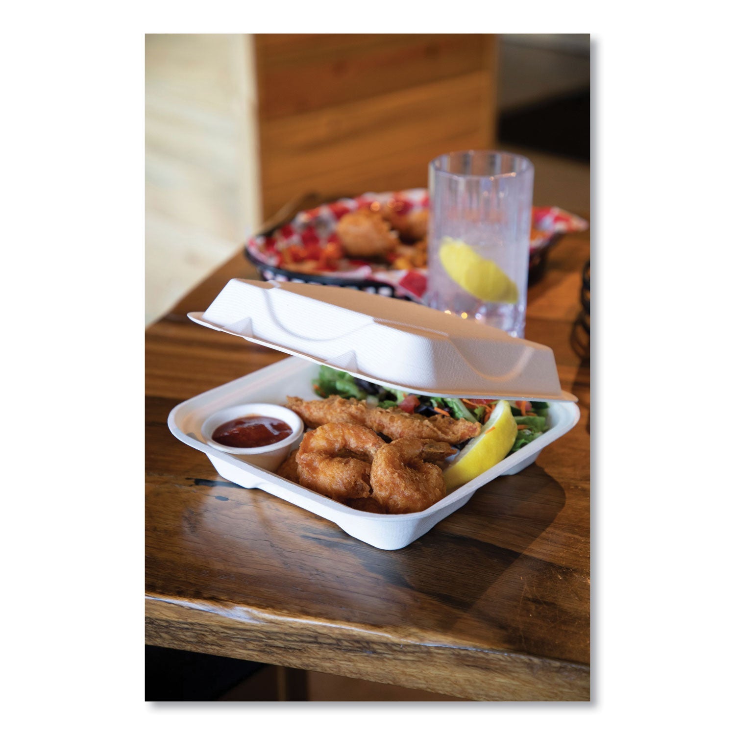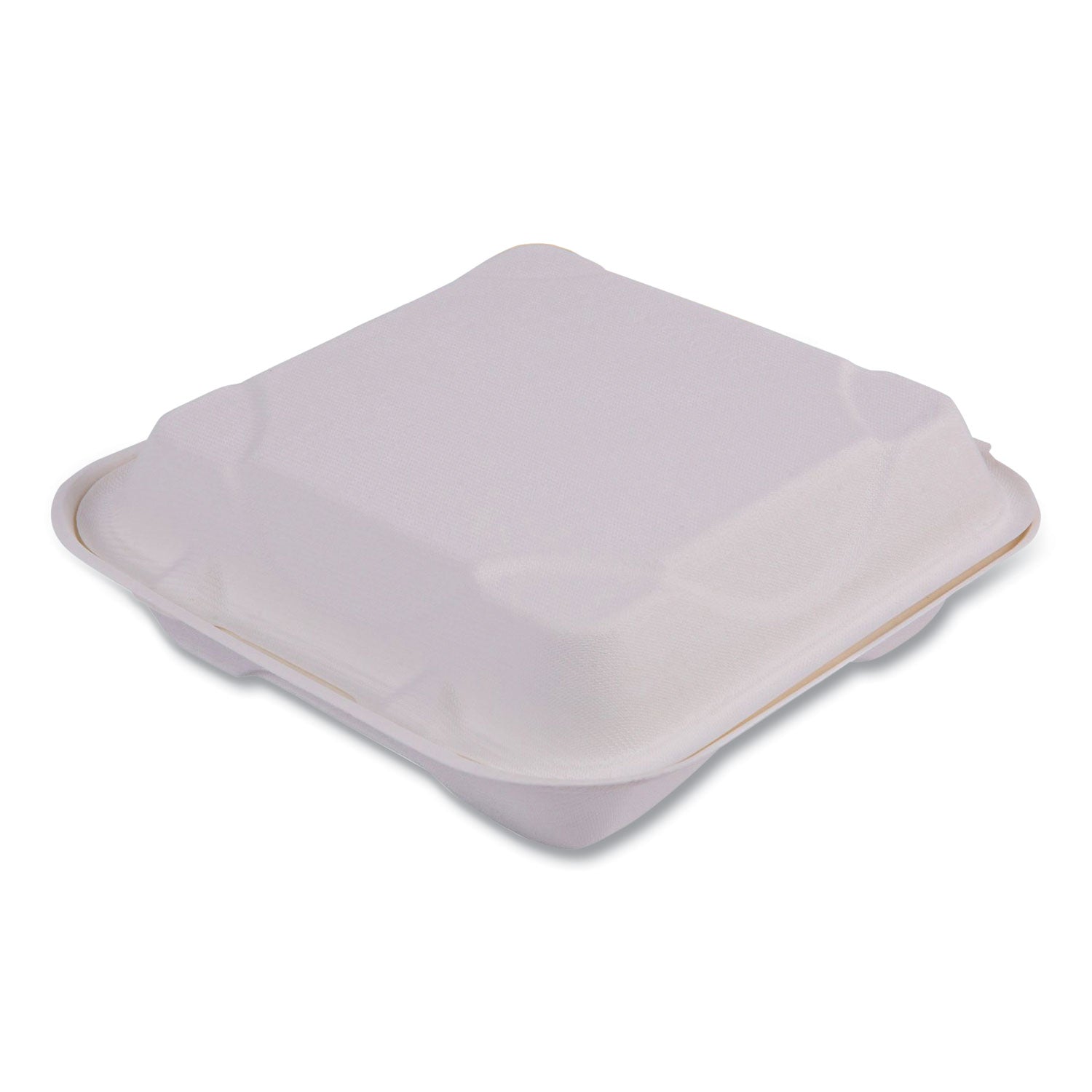 Bagasse Hinged Clamshell Containers, 9 x 9 x 3, White, Sugarcane, 50/Pack, 4 Packs/Carton