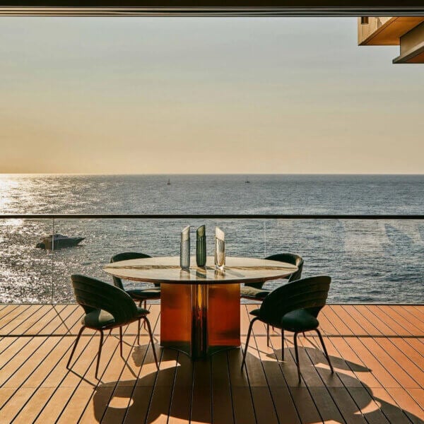The Kerwan round dining table with a marble top, featuring a beveled edge. The sculptural base in stainless steel is composed of three curved volumes converging in a fluid form. A high-resistance technical substrate beneath the top ensures stability and durability. Available with a removable Lazy Susan and customizable metal finishes from the collection.