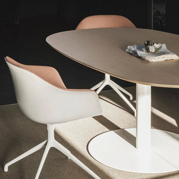 Table with zinc-plated base covered with stainless steel AISI304 “linen fabric” pattern or entirely powder-coated. Column matt chromed or powder-coated. Top in birch plywood veneered in oak, with laminate and visible plywood edge, lacquered MDF, or 5/8″ HPL with birch plywood support. Available with round, square, rounded-square or oval top. Optional height-adjustable version with block-lift system. Felt under the base. Made in Italy.