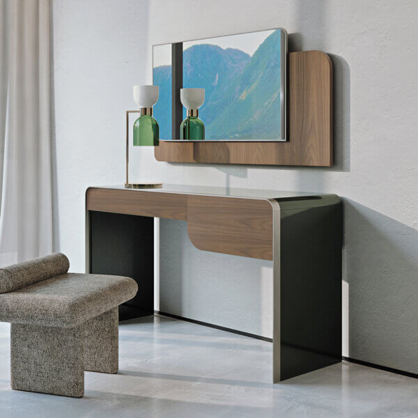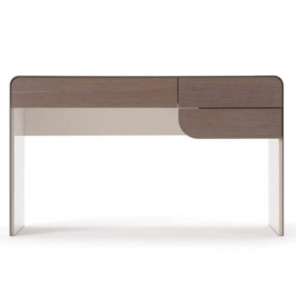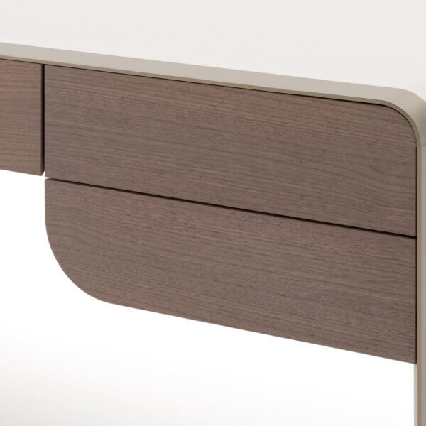 The wooden top with metal edge of the unique Soul Vanity finds its continuation in the linearity of the legs. The presence of the front drawers with wooden, marble or leather fronts makes this Italian furniture piece an essential and functional product for the storage of tricks and objects. Airiness and sense of suspension derive from extreme attention to detail, careful selection of shapes, and a continual search for balanced proportions. The wide range of materials available make it possible to invent creations ideal for personalized contemporary settings. Made in Italy.