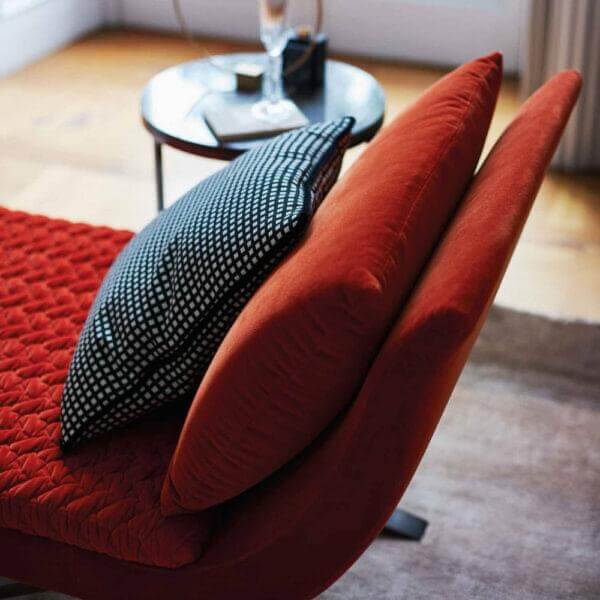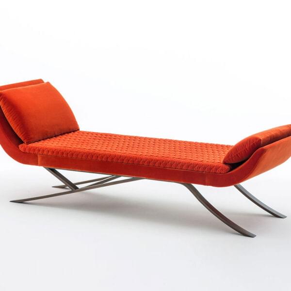 This elegant chaise lounge, named Vittoria, comes with two comfortable cushions and is covered in refined fabric or leather. The high-end metal base is available in the finishes bronze or black nickel.